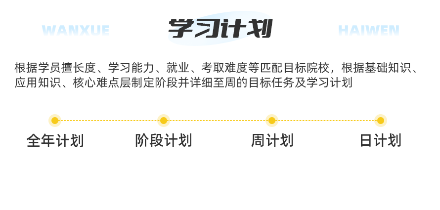 海文深度调研考研各学习任务,归类各科各项知识点,从大量成功备考经验中总结出核心学习任务,并落实到产品体系,帮助考生更好的完成各阶段备考任务